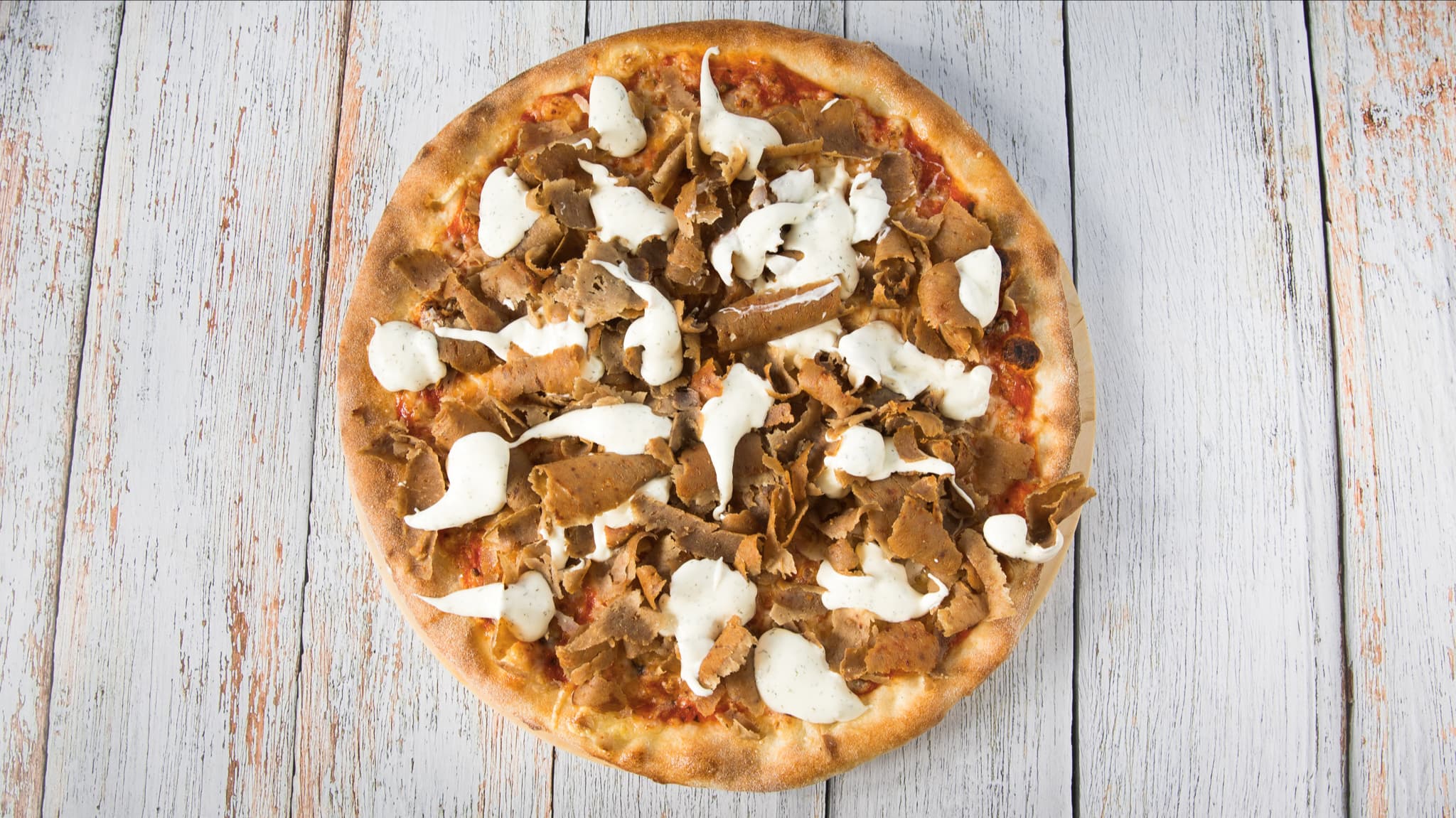gyros hús, joghurtos öntet, mozzarella sajt, paradicsomszósz (32cm)