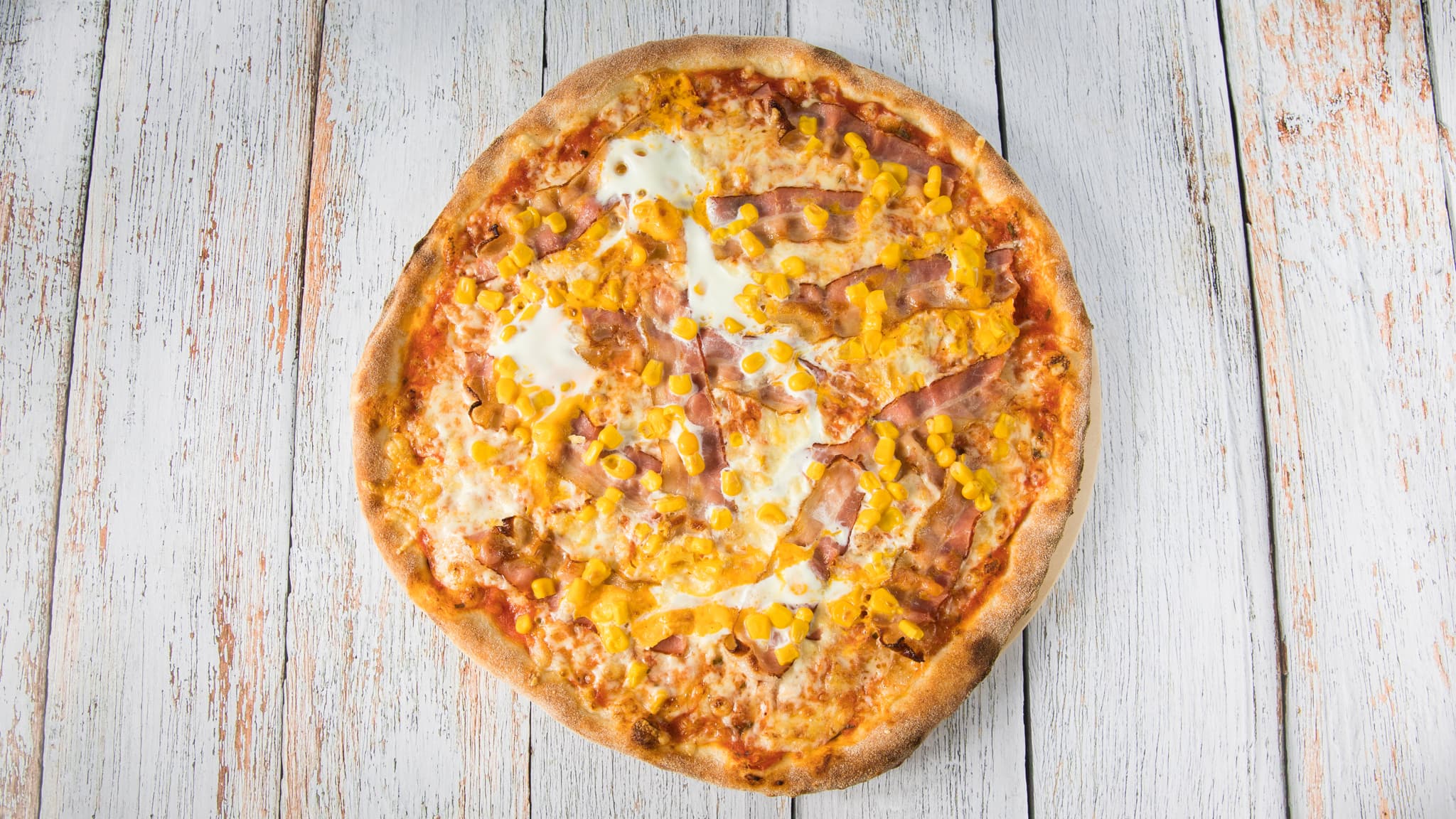 bacon, kukorica, fokhagyma, tojás mozzarella sajt, paradicsomszósz (32cm)